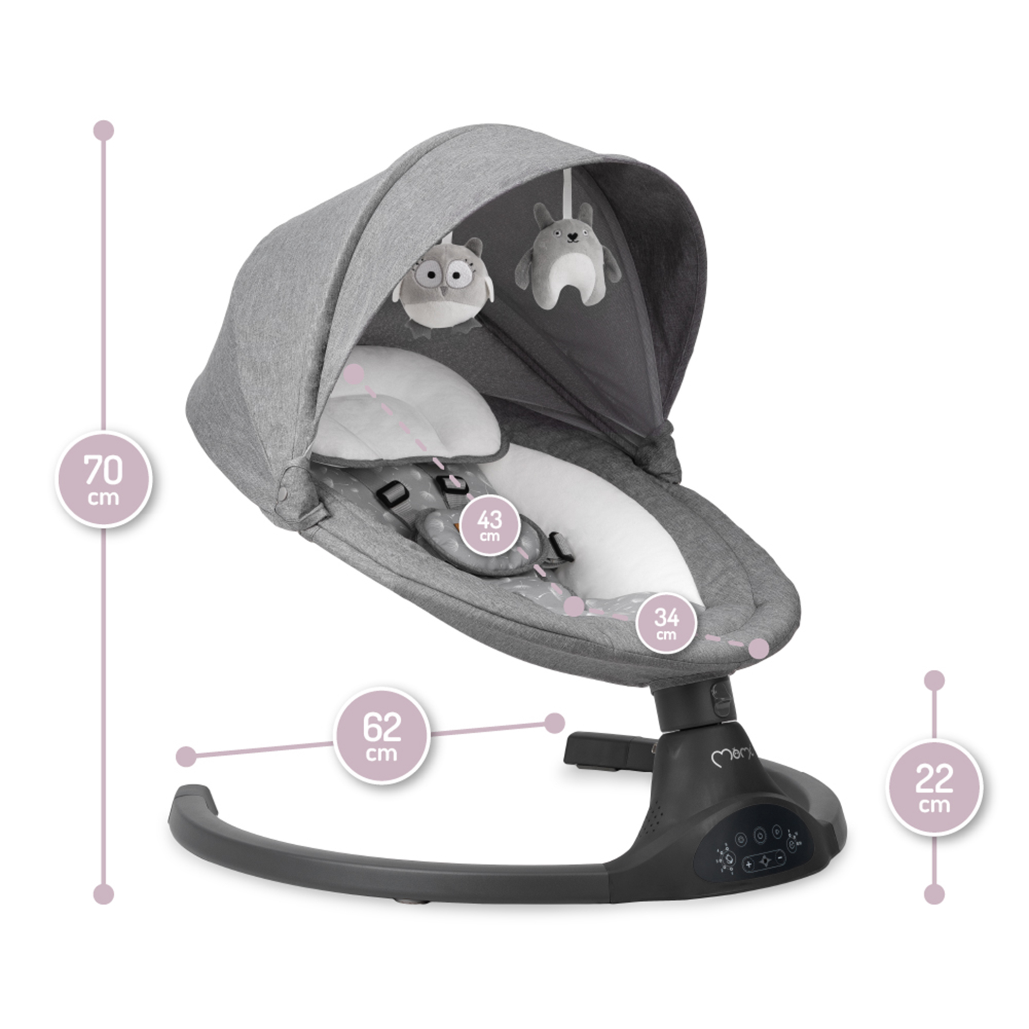  والأفضل يأتي أخيرًا! يمكن التحكم في كرسي MoMi KENANI الهزاز بجهاز تحكم عن بُعد! هذا يعني أنه يمكنك تغيير مستوى صوت اللحن أو سرعة التأرجح عن بُعد وأنت جالس على الأريكة.