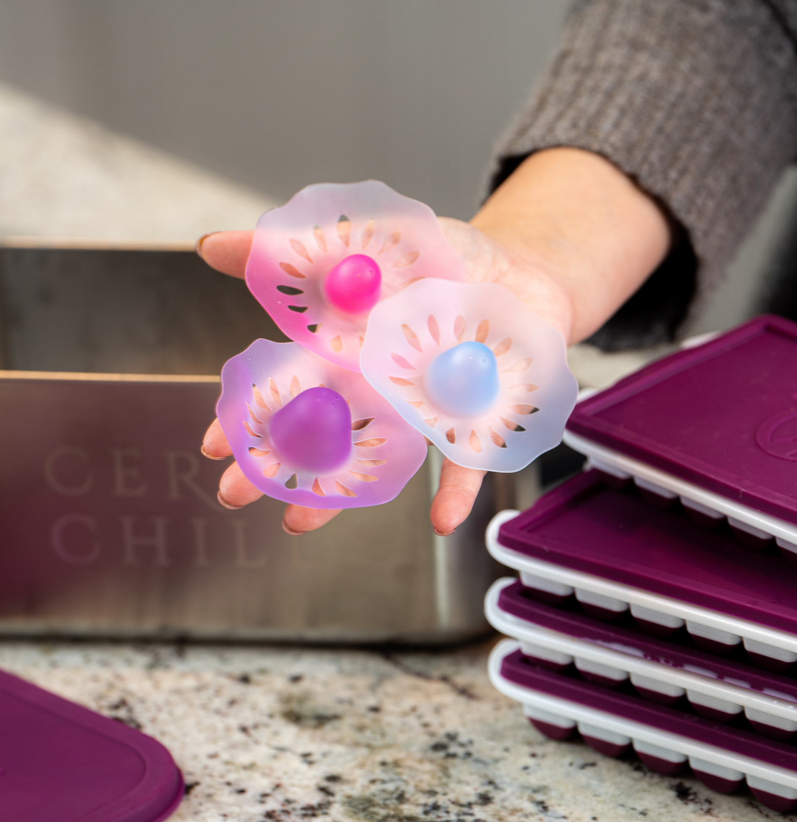 ● Are made of laboratory-tested, food-grade silicone that has a velvety skin-texture on the