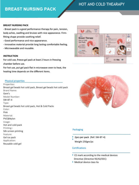 Breast pack is a good performance therapy for pain, tension, body aches, swelling and bruises with nice appearance. Firm fitting shape provide soothing relief.Goodperformance and nice appearance. Innovative material provide long lasting comfortable feeling.Microwavable and reusable. Gel ice pack.