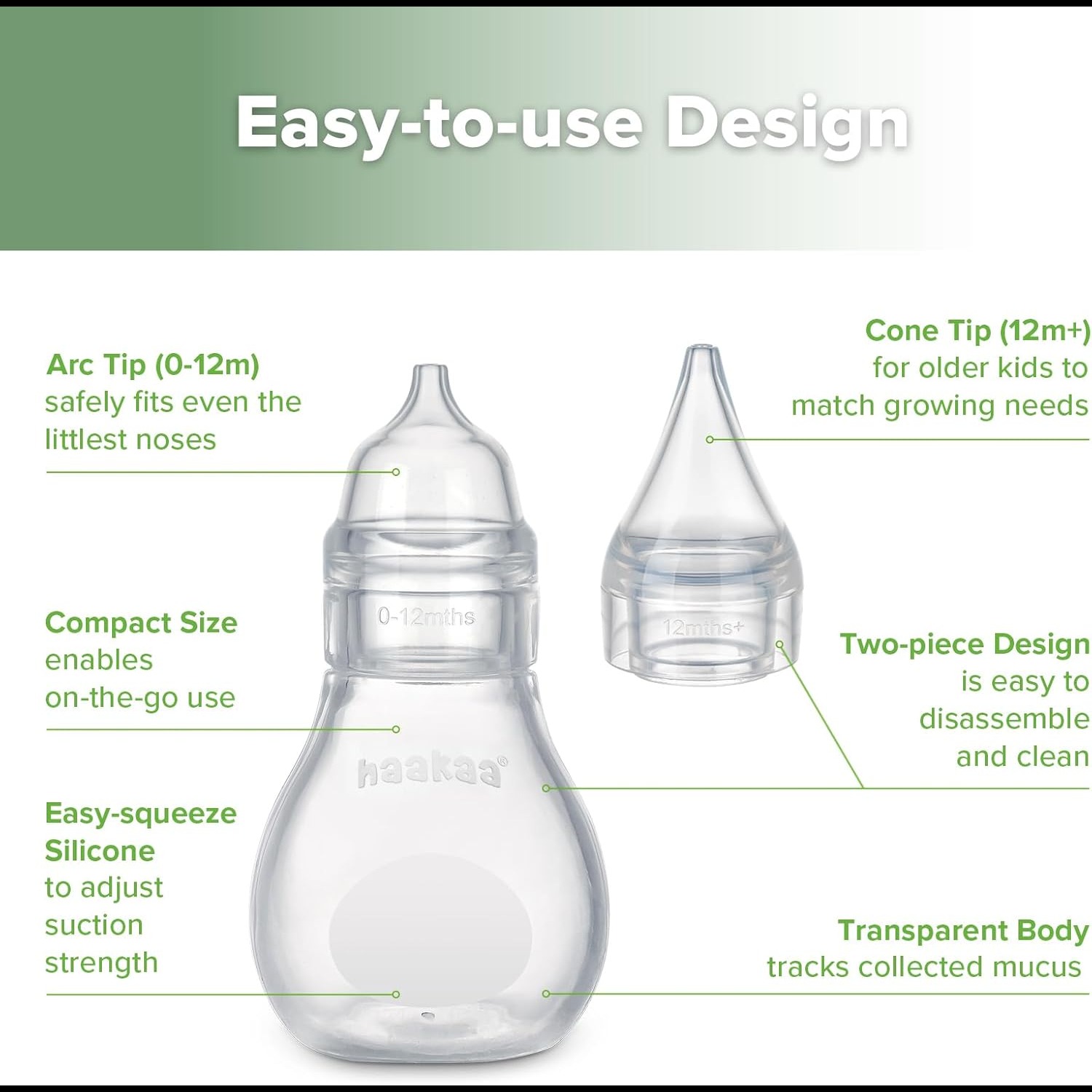 “Haakaa’s Easy-Squeezy Silicone Bulb Syringe is the simplest way to clear your little one’s stuffy, snotty nose! Made of soft, non-toxic 100% food-grade silicone, our Bulb Syringe sucks up nasty stubborn boogers with just a gentle squeeze, clearing your baby’s airways and helping them to breathe easier.