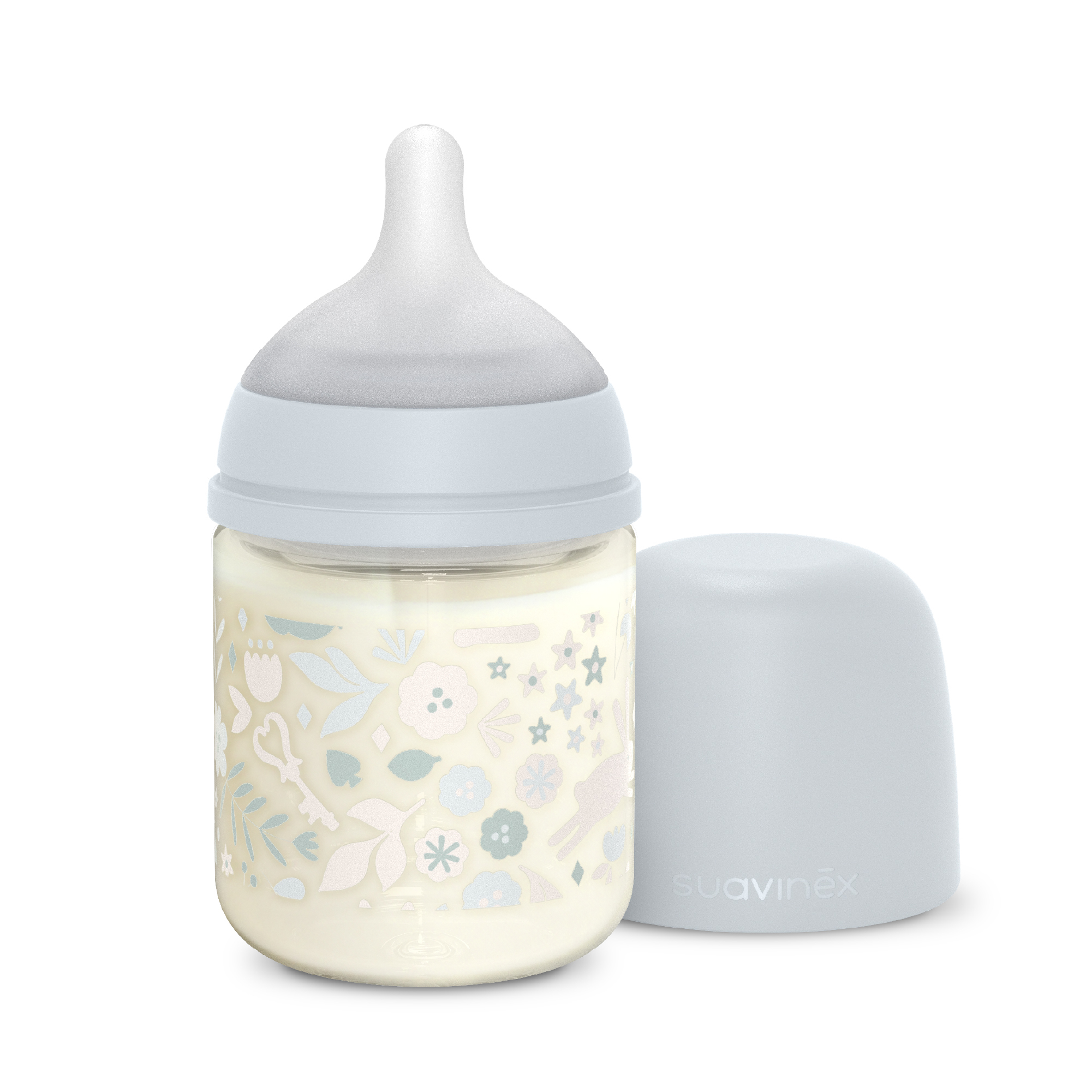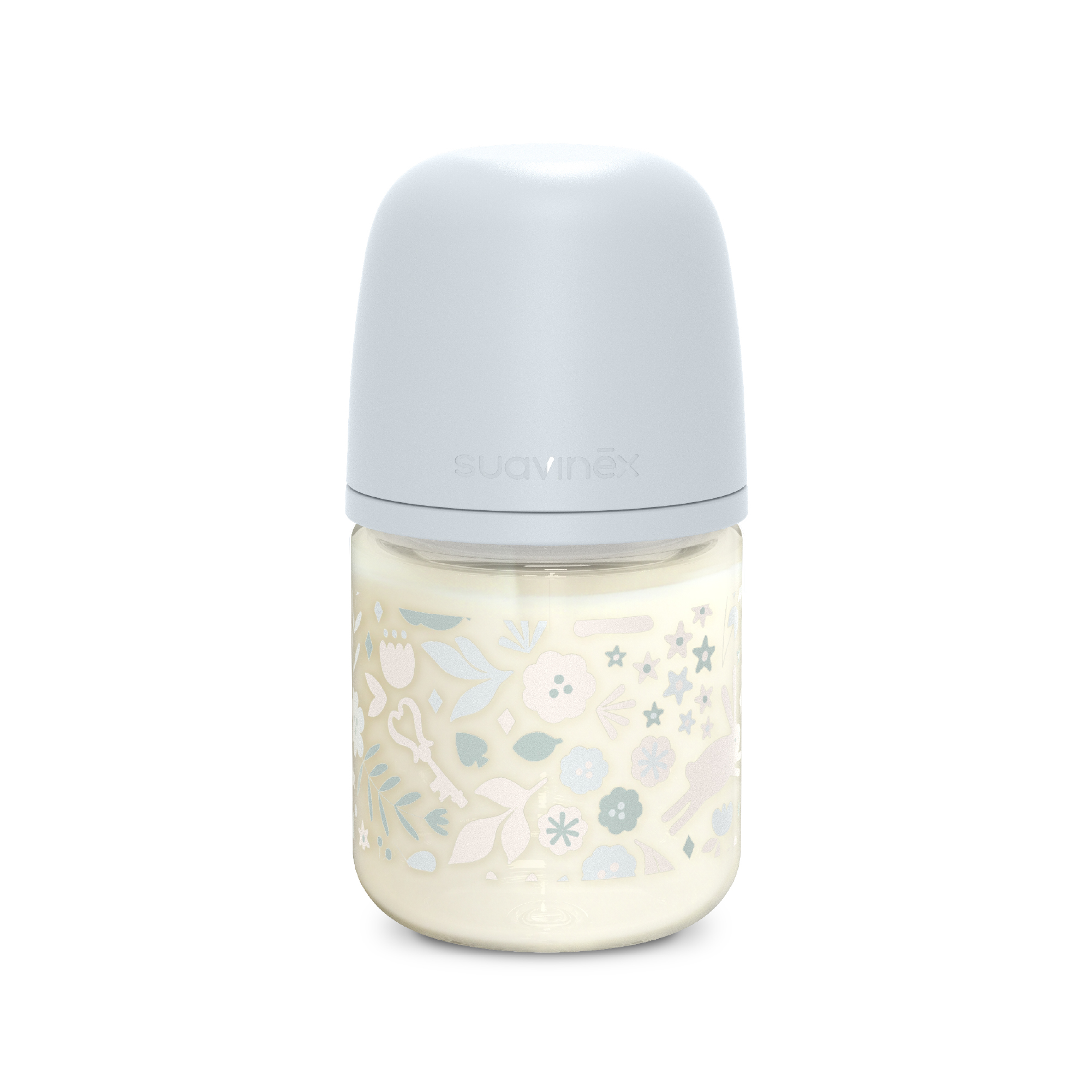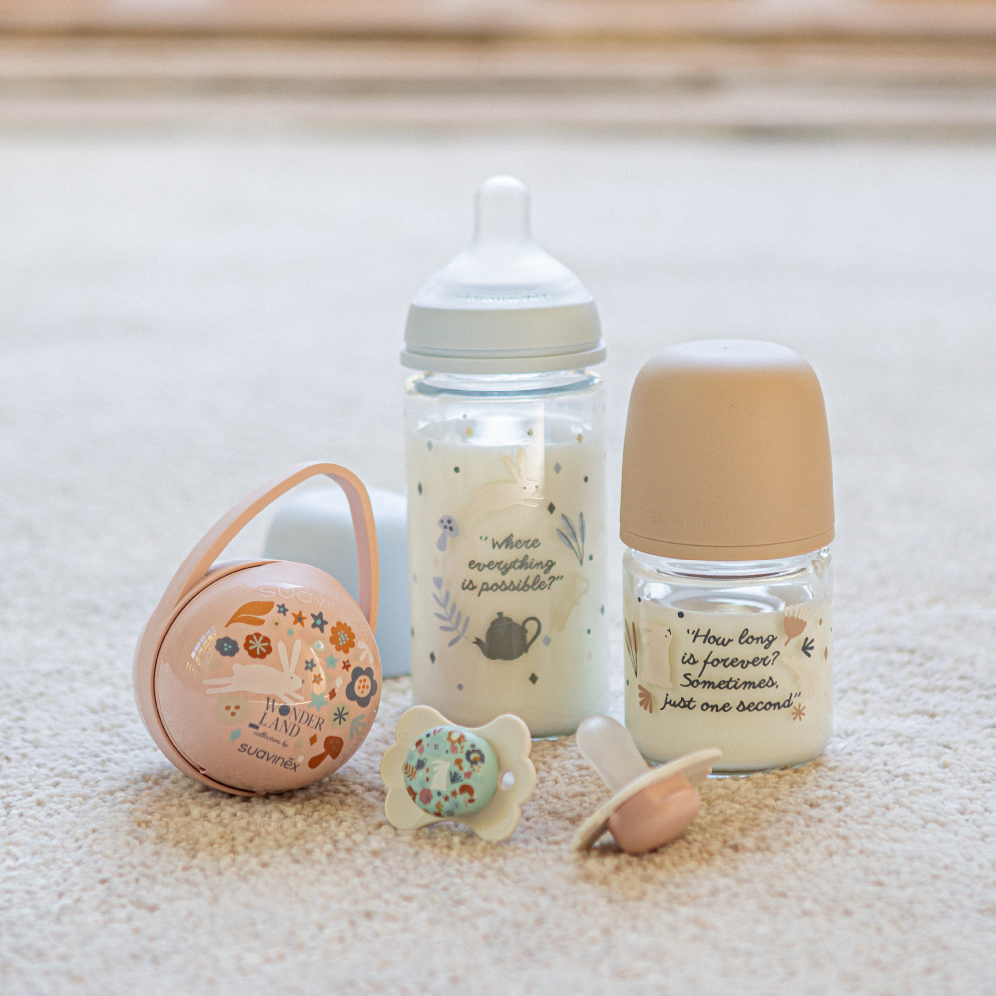 120 ml glass baby bottle from the Wonderland collection of the Suavinex Selection range. 100% recyclable bottle. Does not absorb odors or flavors from food. Bottle with SX Pro Physiological Silicone Teat, Slow Flow, 0+ Months. The Suavinex SX Pro physiological teat is the definitive step towards a more natural diet. Designed to respect the baby’s oral development. The SX Pro physiological teat ensures that the tongue remains in the same natural position as when the baby is breastfeeding. Slow flow bottle teat (0+ Months). It allows a small amount of liquid to pass through, suitable for milk feedings in the first days of life or for water later on. With anti-colic valve. Teat made of ultra-soft, fine silicone with a sandblasted finish that imitates the texture and consistency of the mother’s nipple, achieving maximum warmth, super flexible movement, and maximum adaptation to the shape of the palate. Features of the SX Pro Physiological Teat: Flat, Symmetrical Tip: Leaves room for the tongue to rest. Neck Centered on the Base: Adapts and becomes more comfortable as the baby grows. 20 mm Long Neck: Reaches the junction between the hard and soft palate. Concave, Curved Base: Allows the mouth, tongue, and jaw to be positioned correctly. SX Pro Teat Endorsed by the Spanish Society of Pediatric Dentistry (SEOP). This bottle is part of the Wonderland collection of the Suavinex Selection range.