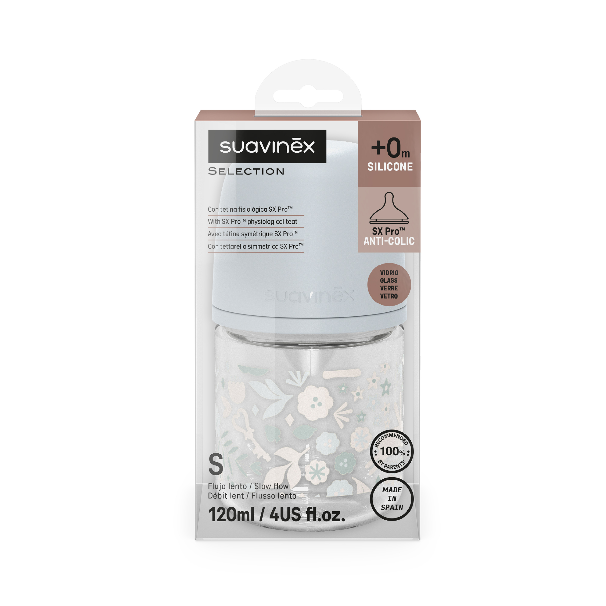 Suavinex Glass Baby Feeding Bottle with Slow-Flow Physiological Nipple Teat, Mimics Natural Breastfeeding Experience, +0 Months 120ml – Blue